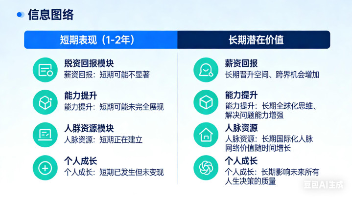· 长期视野:考虑留学背景在未来可能打开的独特路径,如自主创业涉及国际业务、成为专业领域的跨文化桥梁等。